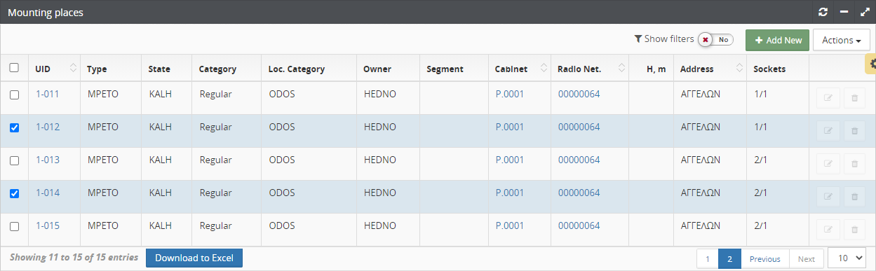 , allow you to select one or more rows to perform actions on the selected records. To select the required row, click on the selection element inside the row, and to group selection of all the elements on this page - in the table header. The selected lines will be marked with a check mark