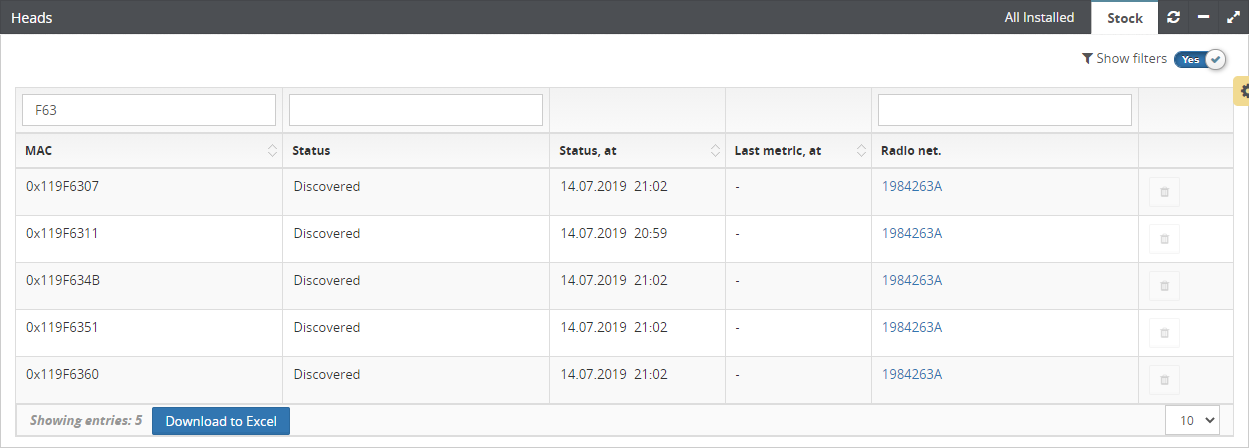 The contents of the table, at the bottom of which there is a button Download to Excel, can be saved in an .xlsx file by clicking this button. The name of the uploaded file is assigned automatically by the system. All displayed records are unloaded. That is, when unloading, filtering and sorting are taken into account.