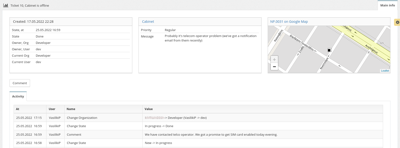 A ticket is a digital representation of registered incident. Incident management is the process of finding problems in street lighting or equipment. Created once, a ticket can be handled by responsible user, or transferred to another user or organization.