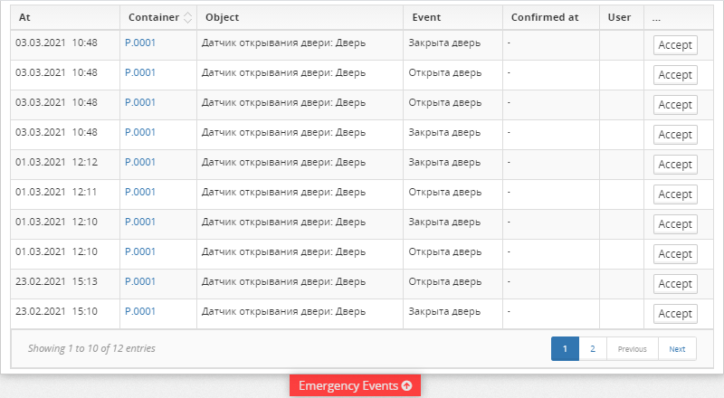 Each critical event must be marked as “accepted” by the dispatcher. To do this, you must click on the Accept button in the table line. The system records the time and the user who confirmed the receipt of the event and excludes this event from the list.