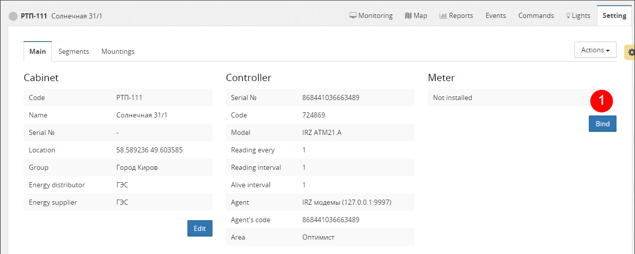 Click the Bind button in the Meter section. A modal window will appear for entering the parameters of the installed meter.