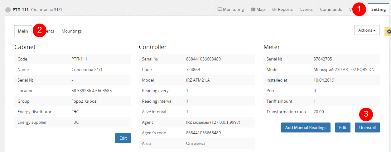 Press the Uninstall button in the Meter section. A modal window for entering dismantling parameters will appear.