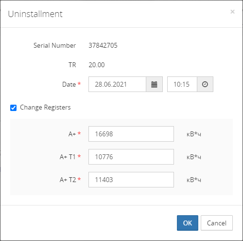 3.1. Set the date and time for removing the meter. 3.2. If necessary, check the box “Change Registers” and enter the value of the active energy read from the meter dial. 3.3. Press the OK button.