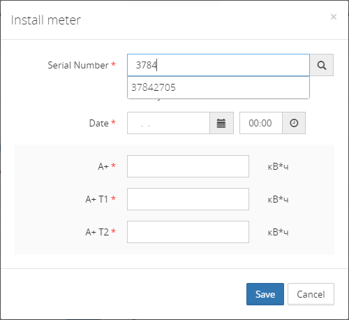 1.1. In the input field “Serial number” start entering the serial number of the meter. The system will prompt the serial numbers of free meters that start with the entered characters.