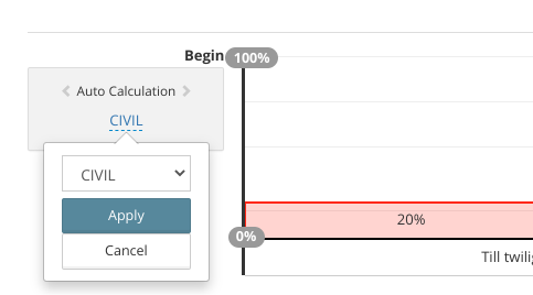 The level 20% states the initial level of dimming, when trigger time (1) reached. Another interval starts when CIVIL twilight ends (Till twilight). The time is calculated automatically based on: day of the year, luminaire geo location, beginning of selected twilight (1)