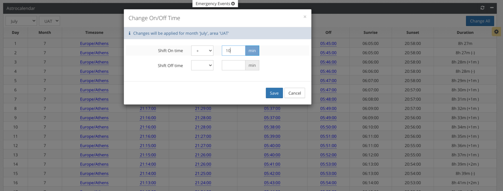 It’s possible to set ON/OFF time later or earlier for every day of the visibly month.