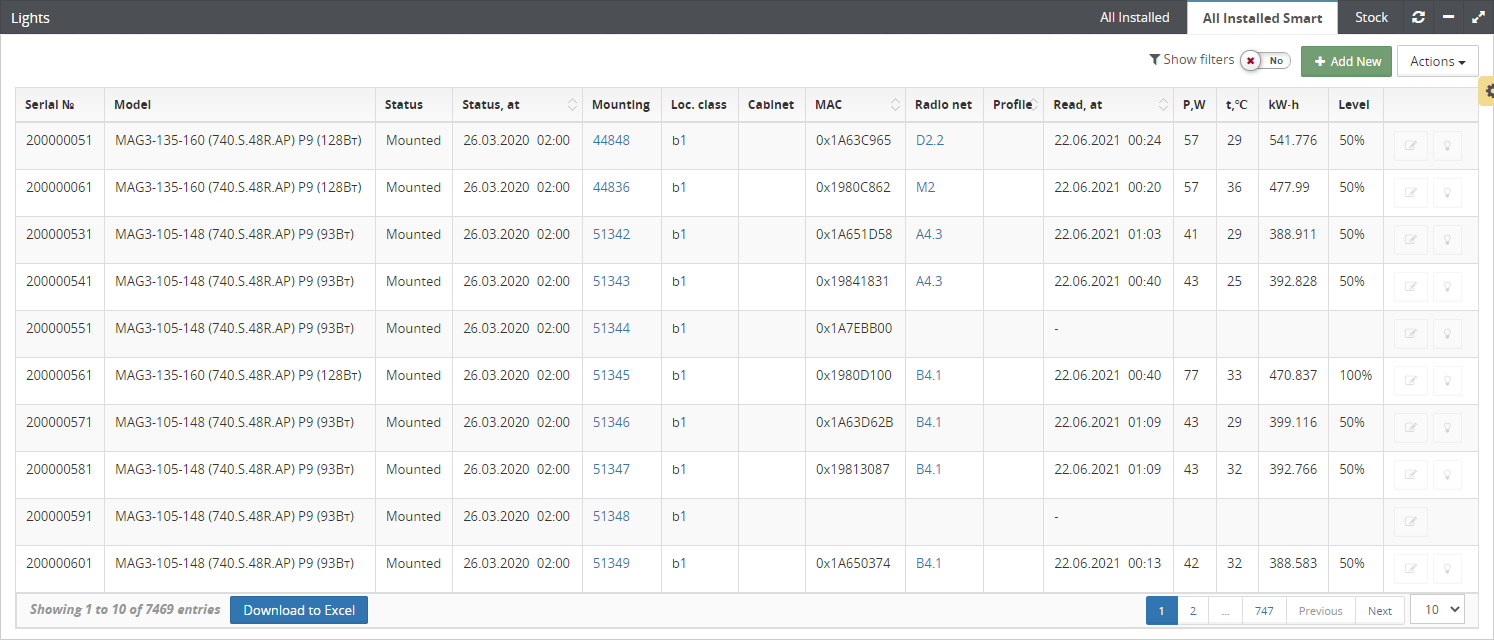 - All installed - luminaires linked to street lighting poles;