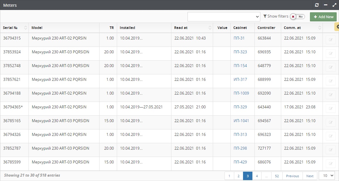 | Value | The value of the meter register from the last successful reading of the readings in accordance with the selected register type in the table header. |
