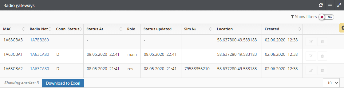 | Created | Date of creation (automatic registration) of the radio gateway in the system |