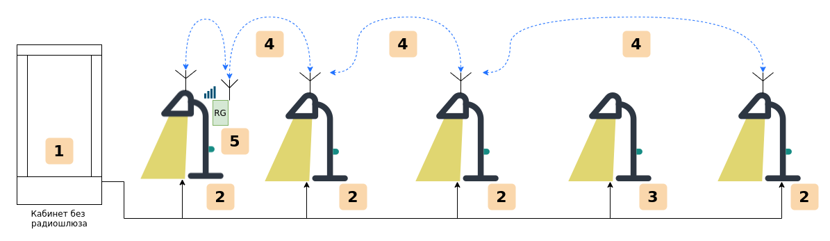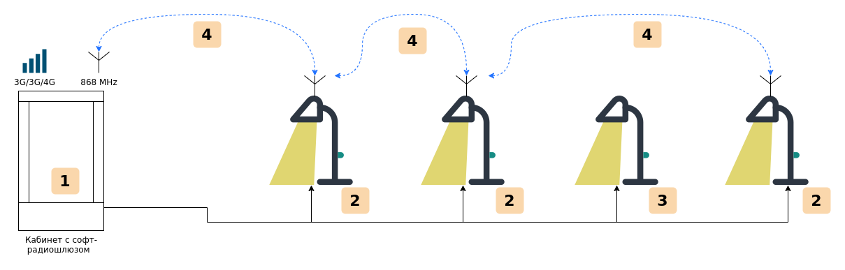 Группа светильников внутри одной радиосети, может обслуживаться несколькими радиошлюзами. Один из радиошлюзов, является главным, другие резервные. Регулярная ротация ролей радиошлюзов, позволяет пропорционально расходовать мобильный трафик на всех сим картах.