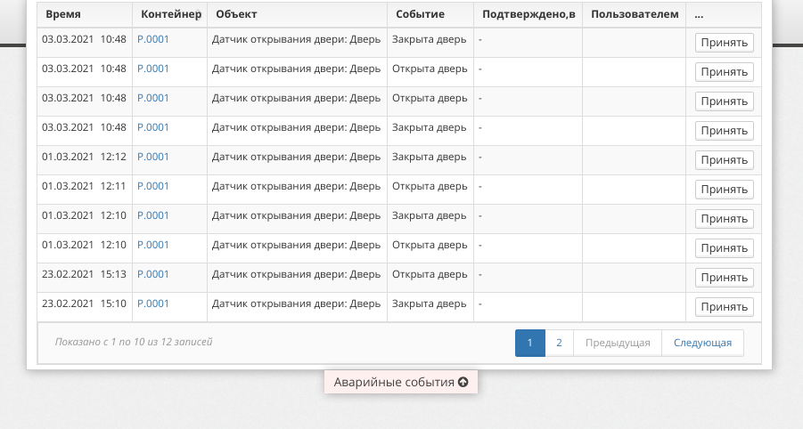 Каждое критическое событие, должно быть отмечено диспетчером как “принятое”. Для этого, необходимо нажать на кнопку “Принять” в строчке таблицы. Система фиксирует время и пользователя, кто подтвердил получение события и исключает данное событие из списка.