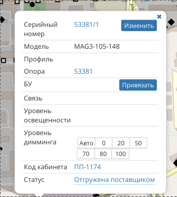 - Для каждого блока управления который еще не привязан к светильнику, выбирается ближайшая опора и управляемый светильник который не связан с блоком управления. С лимитом погрешности в 5 метров.