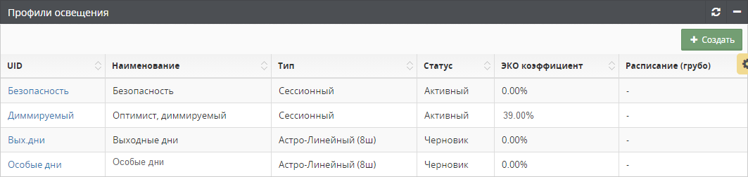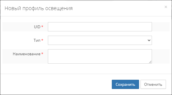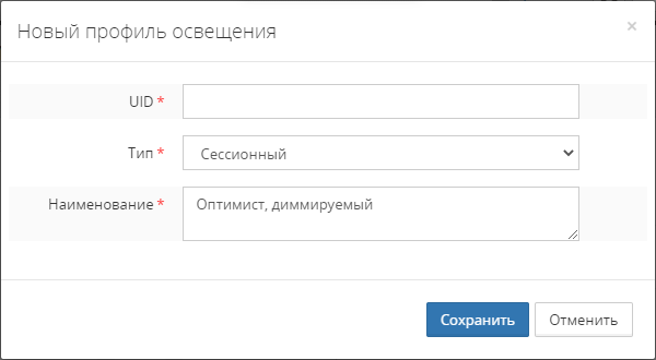 Создание профиля выполняется вводом характеристик профиля в модальном окне Новый профиль освещения