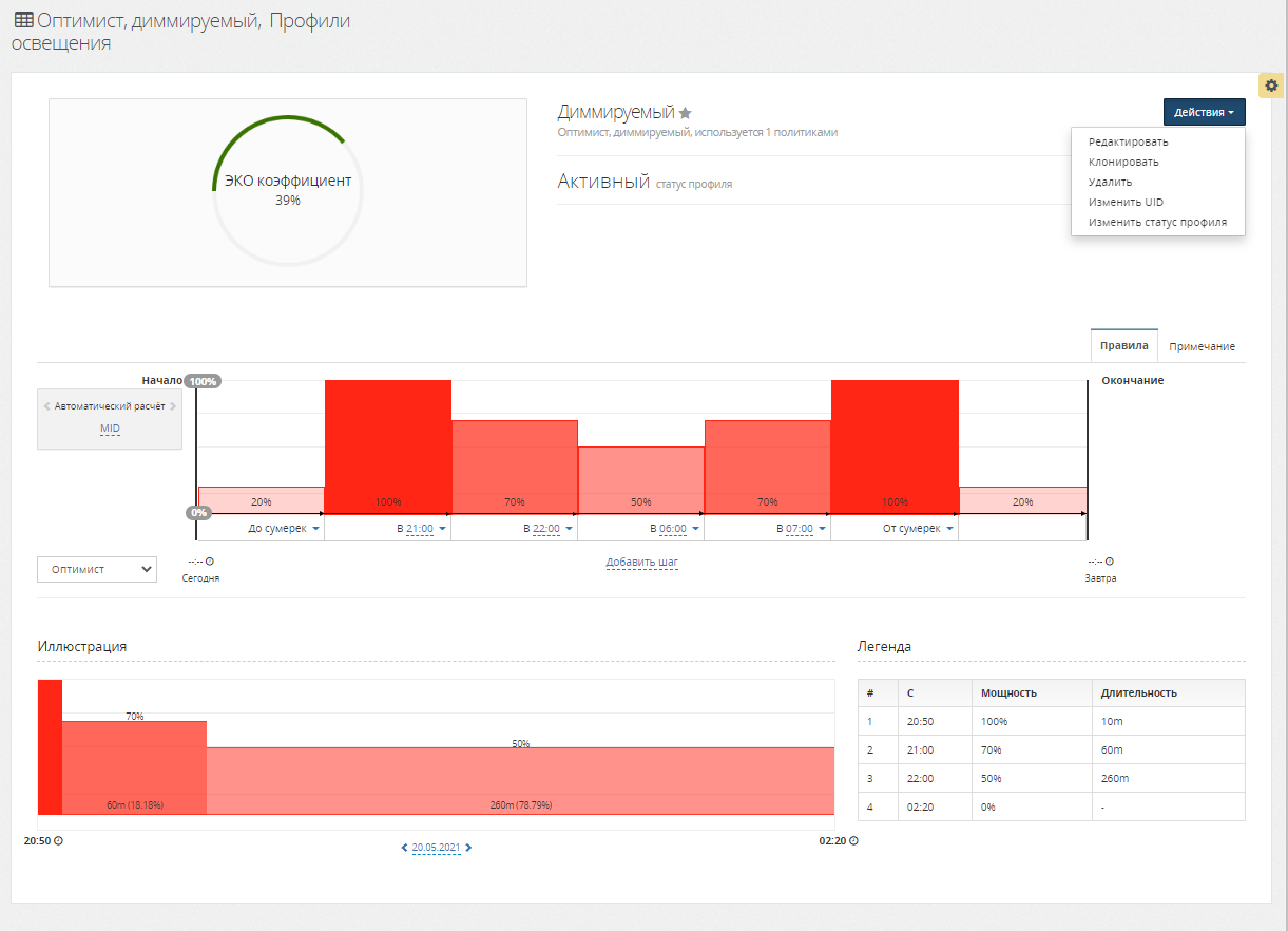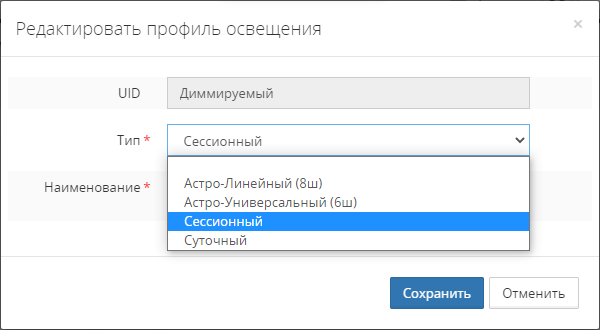 Для редактирования профиля необходимо отредактировать поля модального окна Редактировать профиль освещения