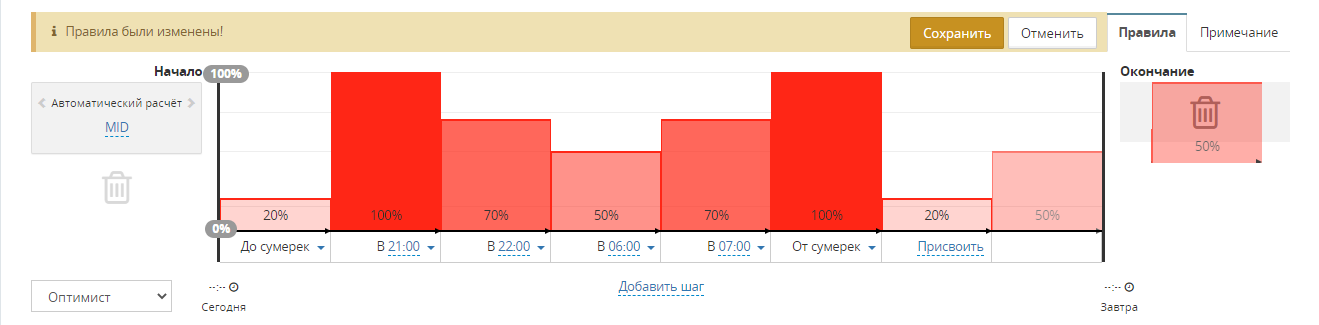 Создания правила димминга выполняется нажатием на кнопку Добавить шаг