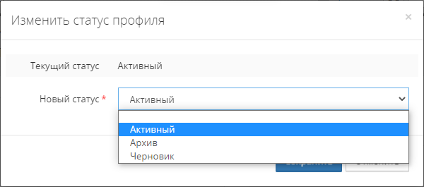 Для изменение статуса профиля необходимо задать новое значение статуса в поле Новый статус модального окна Изменить статус профиля