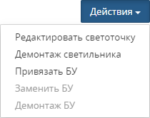 Кнопка Действия содержит скрытый список с нечастыми операциями над текущим объектом, выбранными записями или всеми объектами таблицы. При нажатии на кнопку появляется выпадающий список операций в контексте текущего места:
