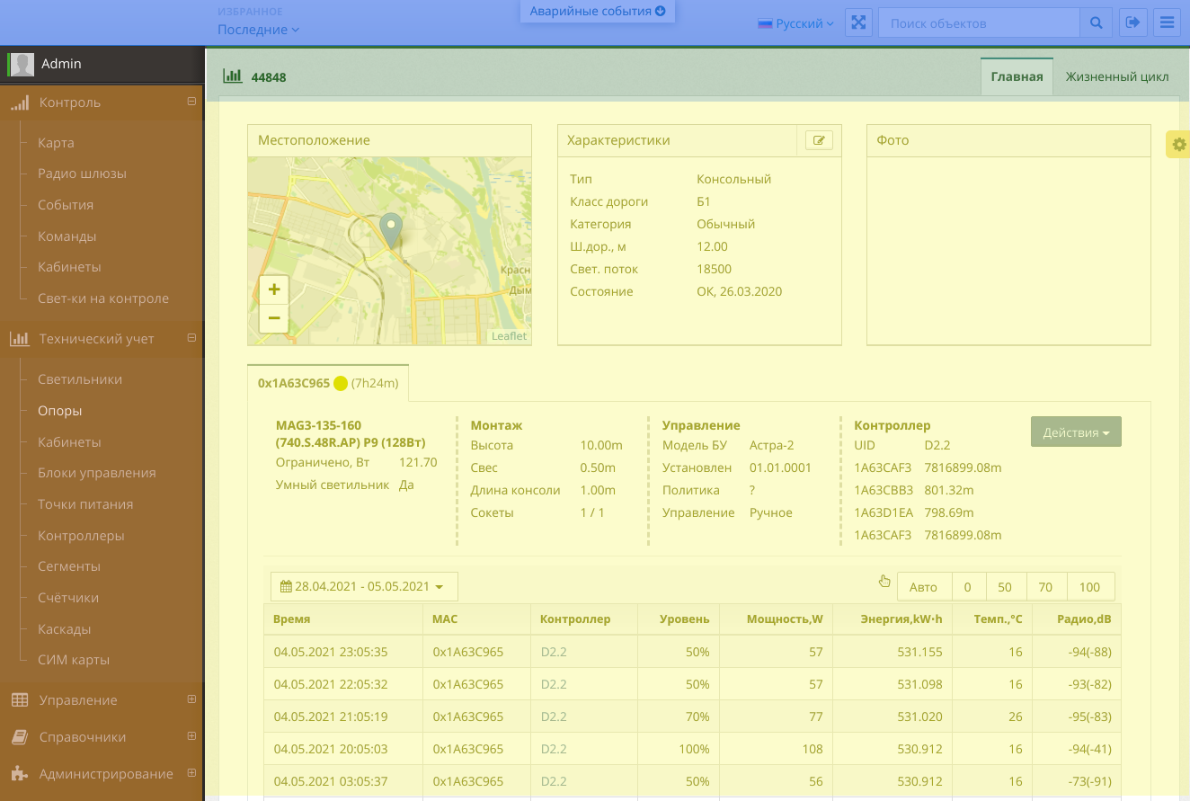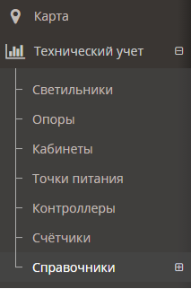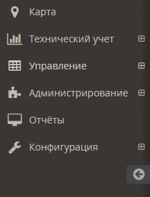 Главное меню интерфейса располагается с левой стороны экрана и служит для выбора функциональных разделов системы, таких как «Технический учет», «Управление», «Администрирование» и т. д. Выбранный элемент в меню всегда выделяется другим цветом. Перед названием раздела располагается обозначающая его пиктограмма (значок, символическое графическое изображение).