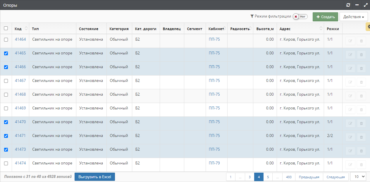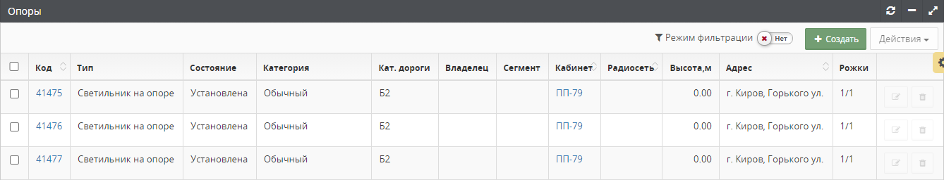 В приведенном примере переход на страницу опоры выполнится по клику на выбранный Код опоры, переход на страницу кабинета выполнится по клику на выбранный Кабинет