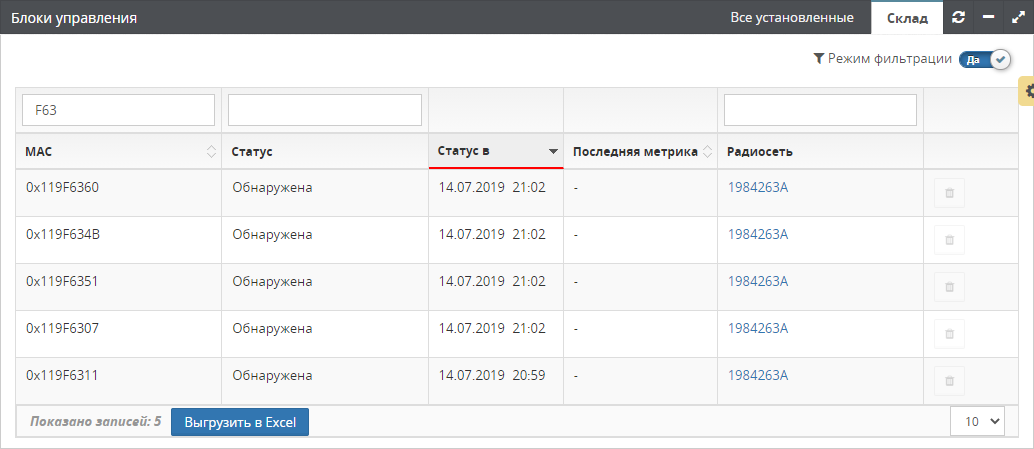 Если таблица поддерживает режим фильтрации записей, то над таблицей будет расположен переключатель Режим фильтрации. По клику активируется режим фильтрации, когда над каждой фильтруемой колонкой появляется поле ввода. Фильтрация записей осуществляется автоматически по мере ввода текста в полях. Если по запросу не будет ничего найдено, появится надпись: «Записей не найдено».