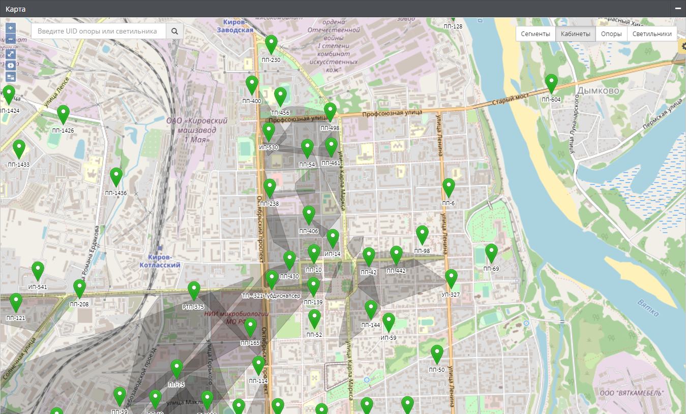 • Просмотр информации об объекте выполняется кликом на маркер. Для разных объектов используются различные как по цвету, так и по форме маркеры: