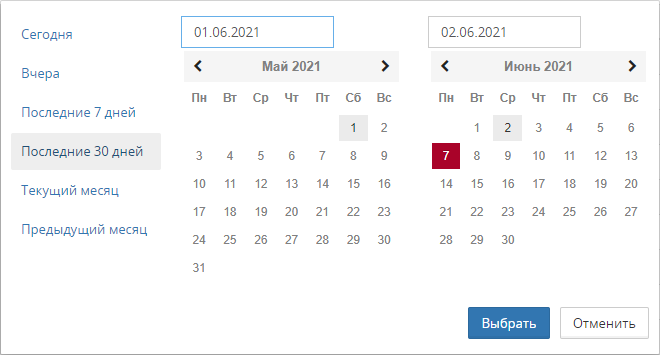 • Кнопка Выбрать предназначена для подтверждения выбранного интервала. При нажатии компонент переходит в свернутый режим. Выбранный интервал обновляется.