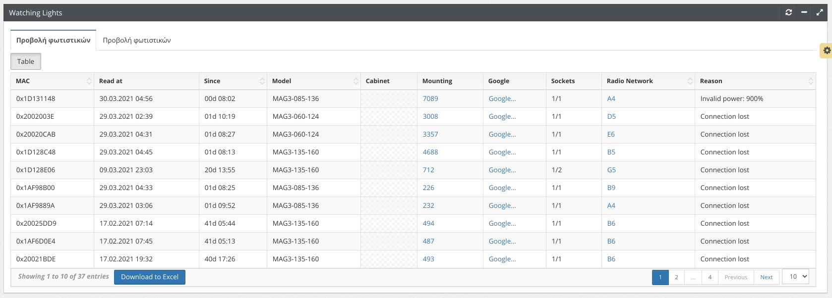 5. Наличие светильника в списке не гарантирует его стопроцентную неработоспособность. Светильник может продолжать нормально функционировать и проблема может быть между светильником и центральной системой при отсутствии связи или с датчиком измерения мощности.