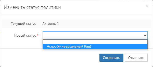 Изменение статуса политики выполняется заданием нового статуса в модальном окне Изменить статус политики