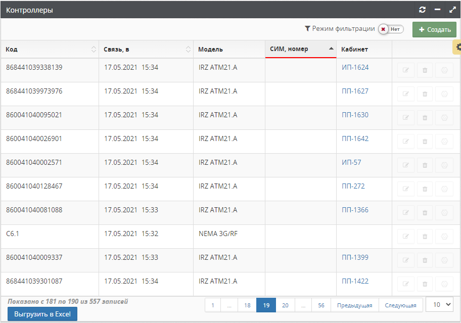 Внешний вид списка Контроллеры при наличии всех прав доступа.